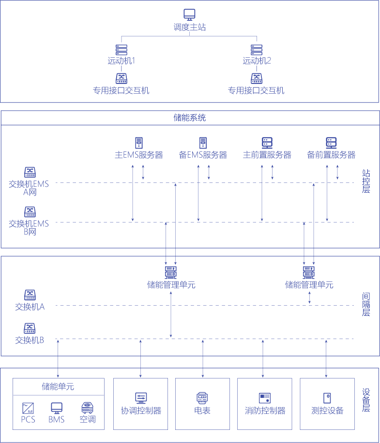 儲能EMS能量管理系統具備實時監控、數據采集、數據處理、系統監視、設備模型管理、事件順序記錄(SOE)、事件及報警處理、遙控遙調/能量調度AGVC/一次調頻、儲能運行策略等功能。系統支持多種工業實時以太網協議、工業總線協議以及電力行業通訊協議,包括IEC104、IEC61850等;具備云邊協同能力和邊緣智能數據處理能力,具有完備的安全特性;具備靈活組網方案,覆蓋多種儲能站類型。